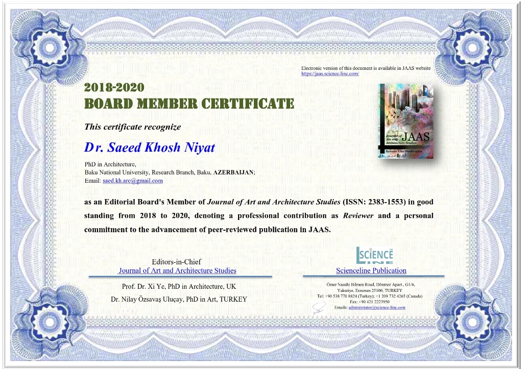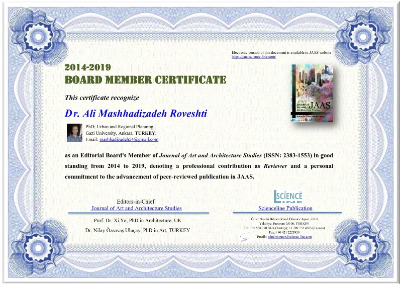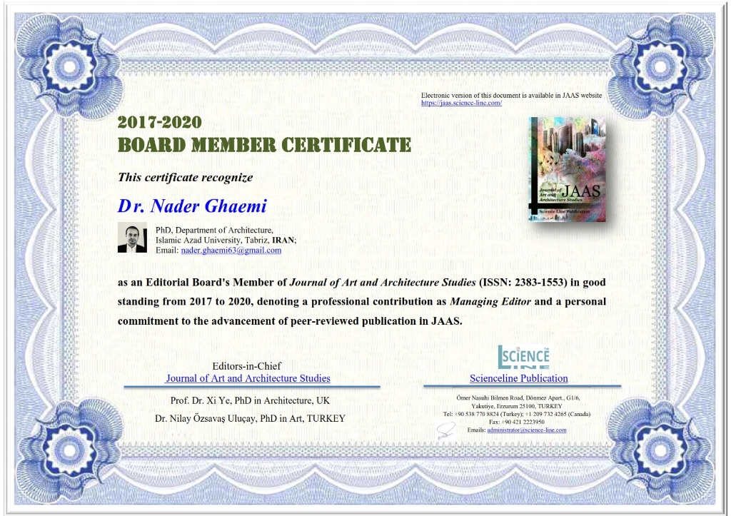 Journal of Art and Architecture Studies has made remarkable progress since its first publication. All accepted articles are published twice a year (biannually). The Journal is pleased to present questionable certificates to JAAS's active editorial board members, the guest editors, reviewers and also award certificate to corresponding authors of "Most Cited Papers" published in the past two years. We appreciate efforts of all the editors and reviewers and also all the authors interested in JAAS.